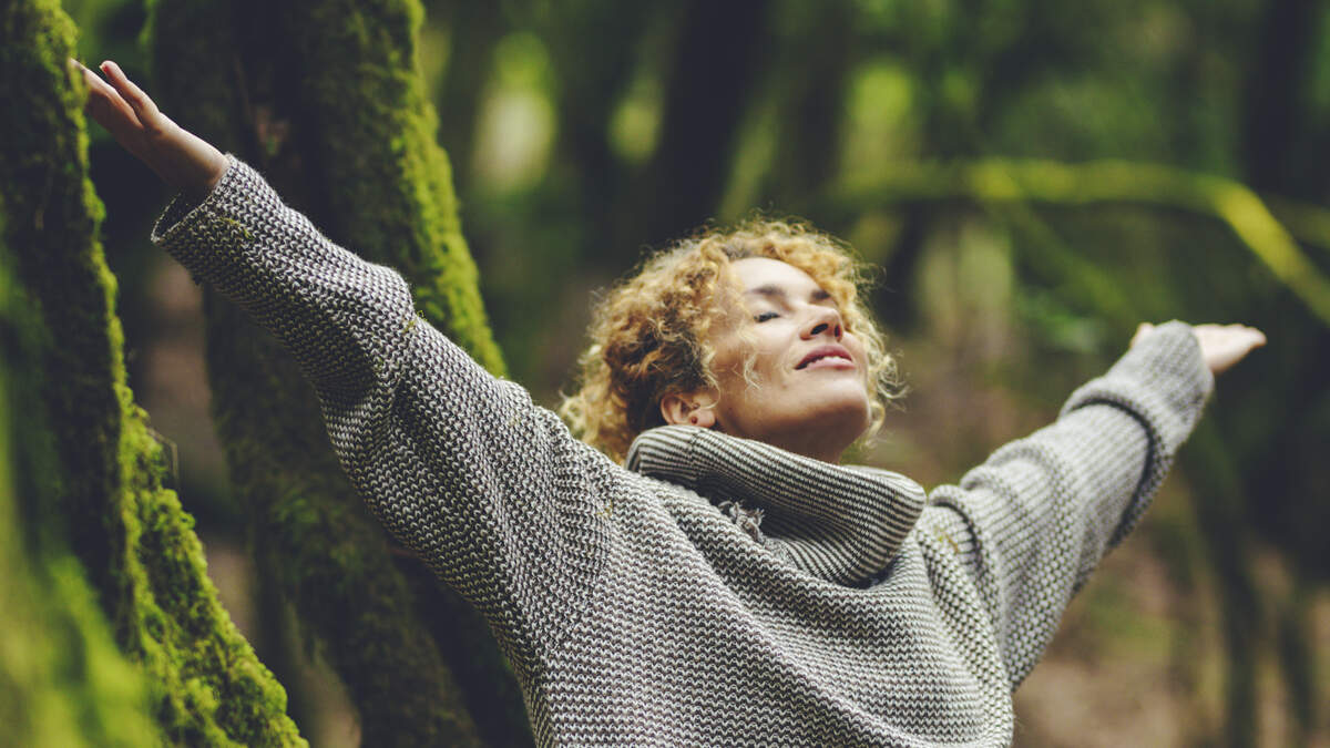 Happiness and nature wellbeing healthy people. One woman smile and enjoy freedom in outdoor leisure activity. Celebrating planet earth. Travel nature destination. Outstretching arms to breathe oxygen
